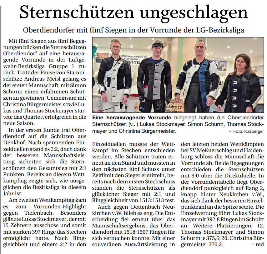 Besonders hervorzuheben seien die Heimwettkämpfe der Schützenmannschaften. Hier kämen laut Schützenmeister regelmäßig viele Fans ins Schützenheim und verfolgen die spannenden Wettkämpfe. Die 1. Luftgewehrmannschaft mit Thomas Stockmayer, Kaderschütze Lukas Stockmayer, Christina Bürgermeister sowie Andreas Meisl liefern sich in der Bezirksliga besonders enge Duelle. Feste Bestandteile im Vereinsjahr seien das Maibaumfest mit den Sauwoidkraxlern sowie die Winterparty mit Perchtenauftritt. Das Maibaumfest wird immer mit der Feuerwehr Oberdiendorf veranstaltet und findet heuer am 24. Mai statt. Im letzten Jahr wurden über 70 Termine wahrgenommen. Darin enthalten waren das Osterschießen, das Maibaumfest, ein Auflage-Cup mit hoher Beteiligung, die Teilnahme am Ferienprogramm, der Huazenberger Dultumzug, das Bürgerschießen, die Feier der Deutschen Vizemeisterschaft von Lukas Stockmayer, der Vereinsausflug zum Attersee, die Vereinsmeisterschaft, die Winterparty, die Adventsfeier mit Königsproklamation und Siegerehrung sowie die jährliche Christbaumversteigerung. Mit der FF und dem TSV-DJK Oberdiendorf habe man eine Brotzeithütte angeschafft, um bei Festen eine Bewirtungsgelegenheit zu haben. Als neues Projekt steht die Installation einer Photovoltaikanlage samt Speicher auf dem Plan. "Damit können wir 75 Prozent unseres Stromverbrauchs abdecken und schonen neben unserem Geldbeutel auch die Umwelt", sagte Schützenmeister Josef Kasbberger. Sportleiter Thomas Stockmayer gab einen Überblick über die zahlreichen sportlichen erfolge der Sternschützen. "Bei der Gaumeisterschaft wurden sage und schreibe 14 erste Plätze erreicht, davon wurden fünf von unserem Kaderschützen Lukas Stockmayer beigesteuert." Besonders erfreulich seien die guten Platzierungen der Schüler in der Sparte Luftgewehr. Maximilian Scholz belegte mit 167,0 Ringen den ersten Platz , die Plätze drei und vier gingen an Sofia Hillewoth und Johannes Graf. In der Rundenwettkampfsaison 2023/2024 stellten die Sternschützen sieben Mannschaften: drei Luftpistolenmannschaften, zwei Teams Luftgewehr Auflage und zwei Luftgewehrmannschaften. Der ersten Luftgewehrmannschaft mit Thomas Stockmayer, Lukas Stockmayer, Christina Bürgermeister und Andreas Meisl gelang erstmalig in der Vereinsgeschichte der Aufsteig von der Gauoberliga in die Bezirksliga. Besonders stolz sind die Sternschützen auf ihren Ausnahmeschützen Lukas Stockmayer. Dieser war Bundesweit im Schießsport aktiv. Er erzielte dabei bei den Wetkämpfen in München Hochbrück und in Berlin hervorragende Platzierungen. Auch bei der Deutschen Meisterschaft war Lukas in Aktion. Höhepunkte waren die Qualifikation für die Nationalmannschaft in Suhl und Hochbrück und das Sichtungsschießen in Frankfurt, bei dem er sich mit dem vierten Platz für den Ausscheidungswettkampf zur EM 2025 qualifizierte. Auch bei der Bezirksmeisterschaft konnten sehr gute Ergebnisse erzielt werden. Außerdem stand auch ein Auflage-Cup auf dem Programm. Die Teilnahme an der Bayerischen Meisterschft in München Hochbrück war ebenfalls erfolgreich. Vier Schüler nahmen an den Jugendfernwettkämpfen teil. Abgerundet wurde das sportliche Programm durch die Teilnahme beim Stadtpokalschießen und der Vereinsmeisterschaft.