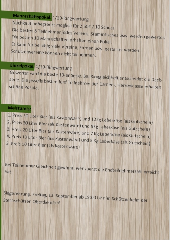 Pro Verein sind maximal zwei Mannschaften mit jeweils 3 Schützen Startberechtigt. Geschossen wird im Wettkampfmodus mit 10tel Ringwertung (je Schütze 30 Wettkampfschüsse, max. 10 Probeschüsse).